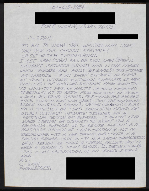 Letter to C-SPAN, 1984-04-15; 76105