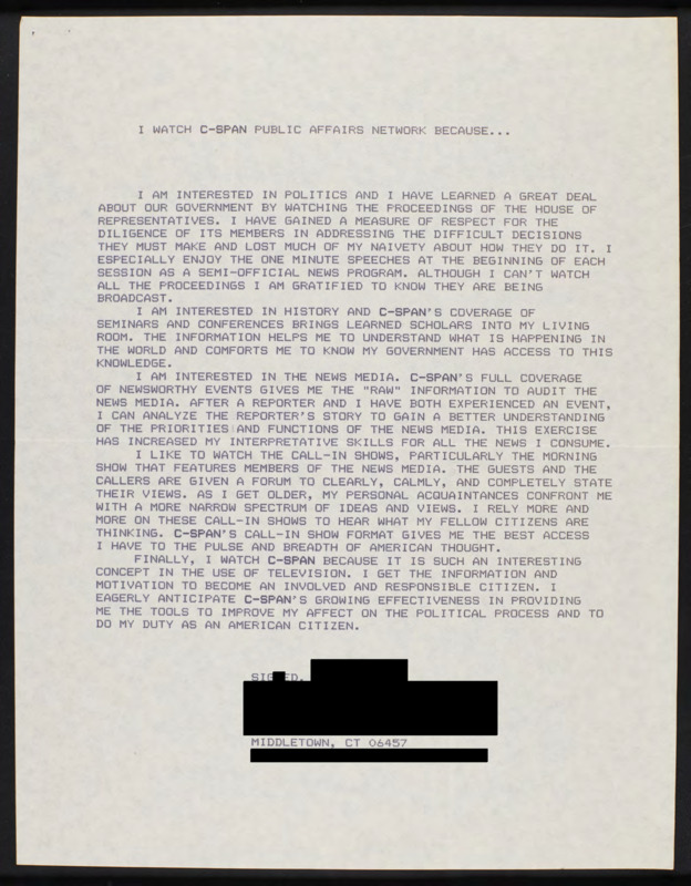 Viewer entry for "Why I Watch C-SPAN" contest.