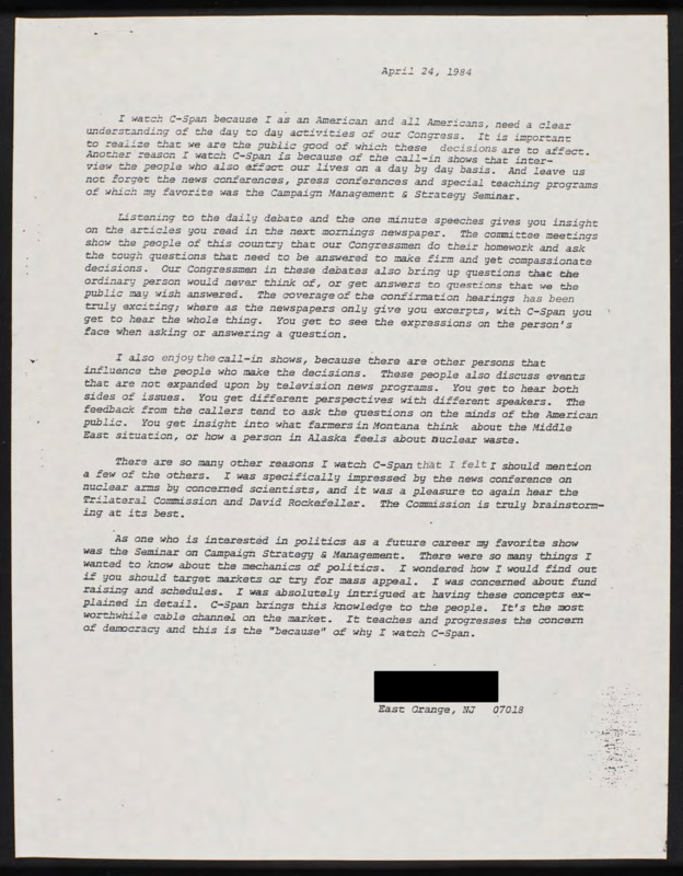 Viewer entry for "Why I Watch C-SPAN" contest.