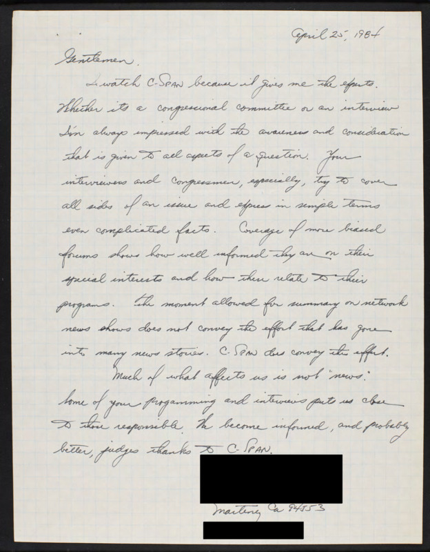 Letter to C-SPAN, 1984-04-25; 94553
