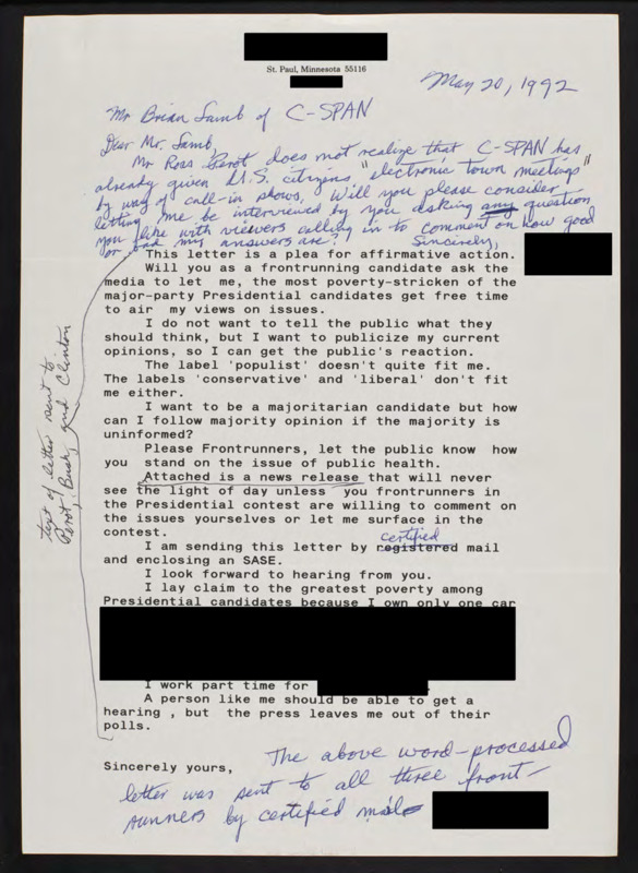 States that Ross Perot's idea of "electronic town meetings" already exists because of C-SPAN and requests air time from the presidential candidates.