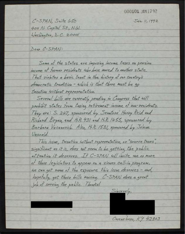 Requests C-SPAN invite legislatures to discuss the pension tax bills.