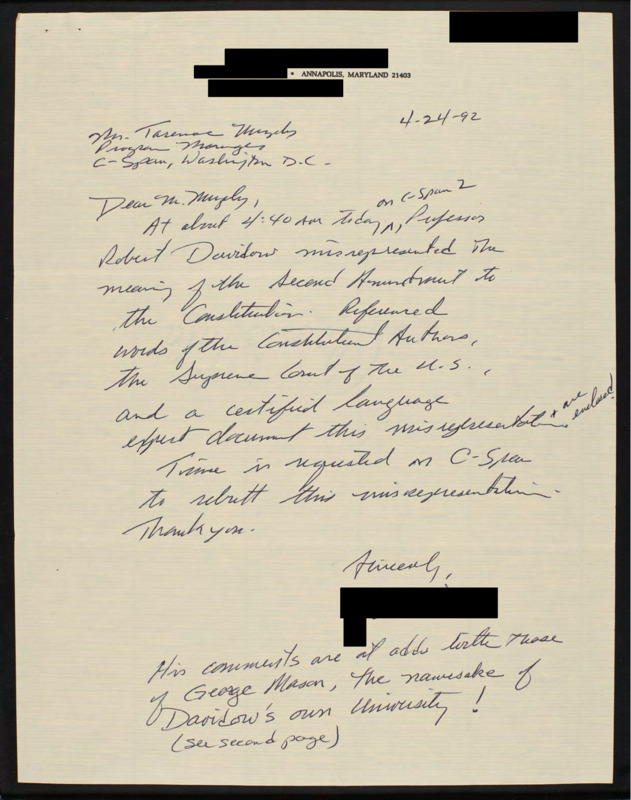 Explains why they believe a C-SPAN guest misrepresented the meaning of the Second Amendment. Attached is a business card and information concerning the Second Amendment and the U.S. Constitution.