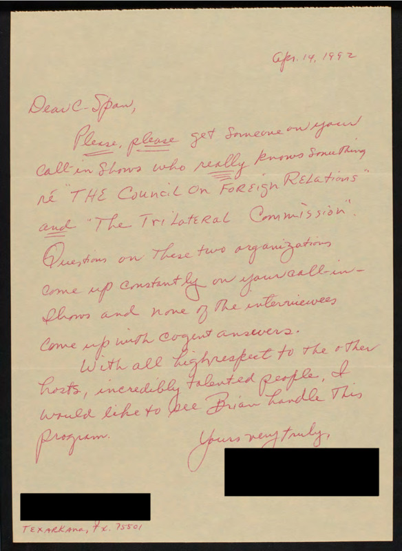 Asks C-SPAN to invite someone on the call-in show with knowledge of The Council on Foreign Relations and The Trilateral Commission.