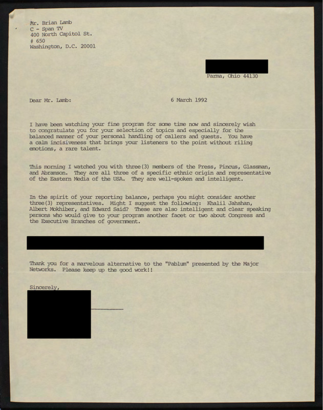 Congratulates C-SPAN for balanced programming and suggests three people for C-SPAN to invite.