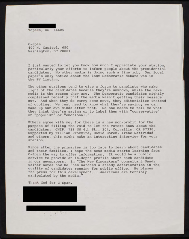 Appreciates C-SPAN for coverage of the Presidential candidates and compares it to other news outlets. Promotes a non-profit organization for an interview.