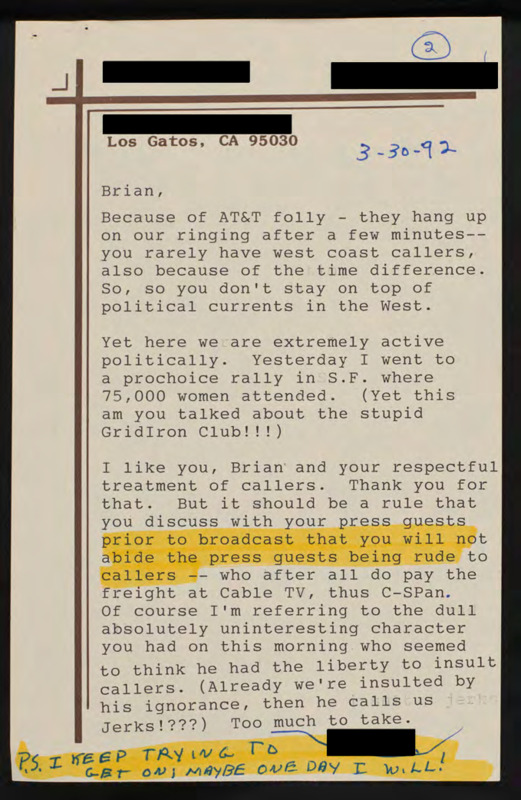 Asks Brian Lamb to create a rule against guests being rude to callers; asks for call-in segment focused on the West Coast; promotes Ross Perot.