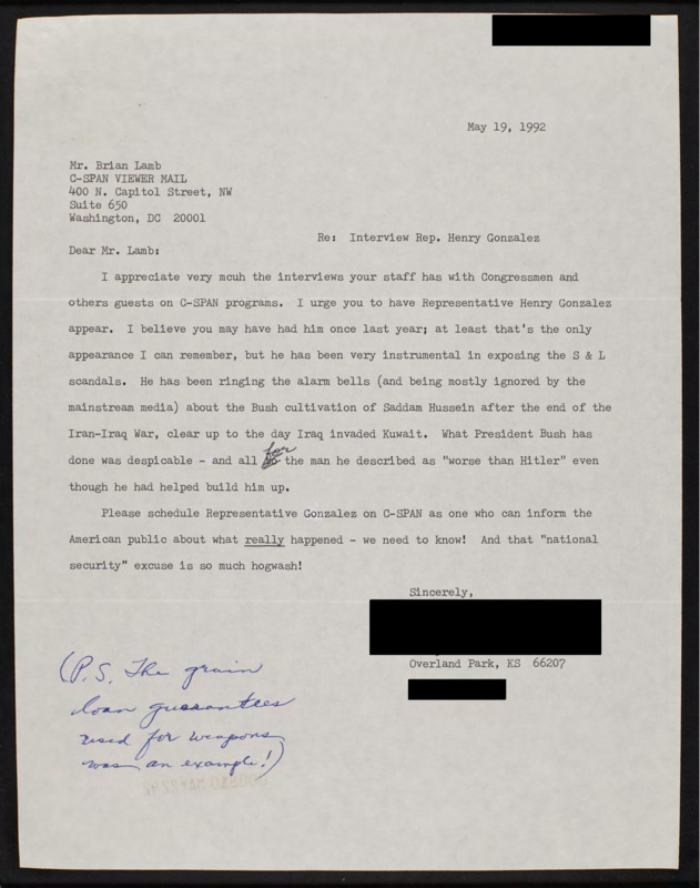 Requests Henry Gonzalez be invited to speak about George Bush's relationship to Saddam Hussein.