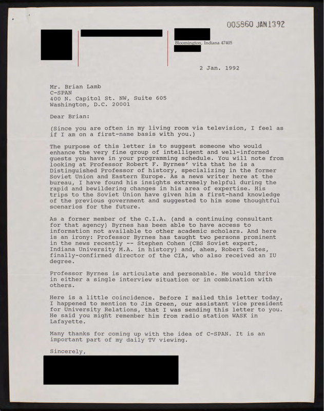 Suggests and promotes Robert F. Byrnes for an appearance on C-SPAN. Attached is a resume for Robert F. Byrnes.