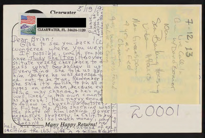 Asks Brian Lamb to invite a researcher, Judy Shelton, on C-SPAN to discuss Gorbachev.