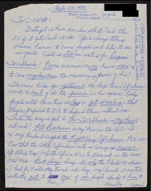 Letter to C-SPAN, 1992-02-29; 64772
