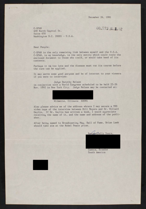 Requests a C-SPAN with Judge Dorothy Nelson and information about obtaining a video tape copy of an interview. Attached are excerpts from a book about race, capitalism, morality, and spirituality.