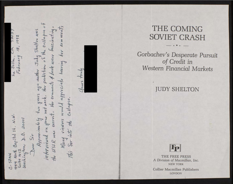 Asks C-SPAN to invite author Judy Shelton for an interview about the collapse of the USSR.