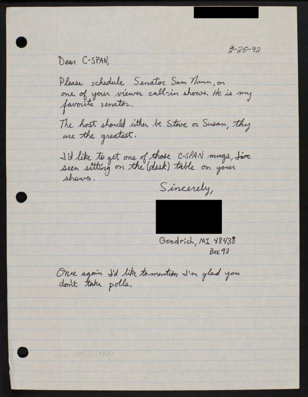 Requests C-SPAN merchandise and Sam Nunn for a call-in show.