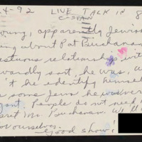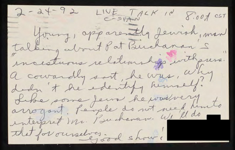 Complains about a Jewish guest's criticism of Pat Buchanan.