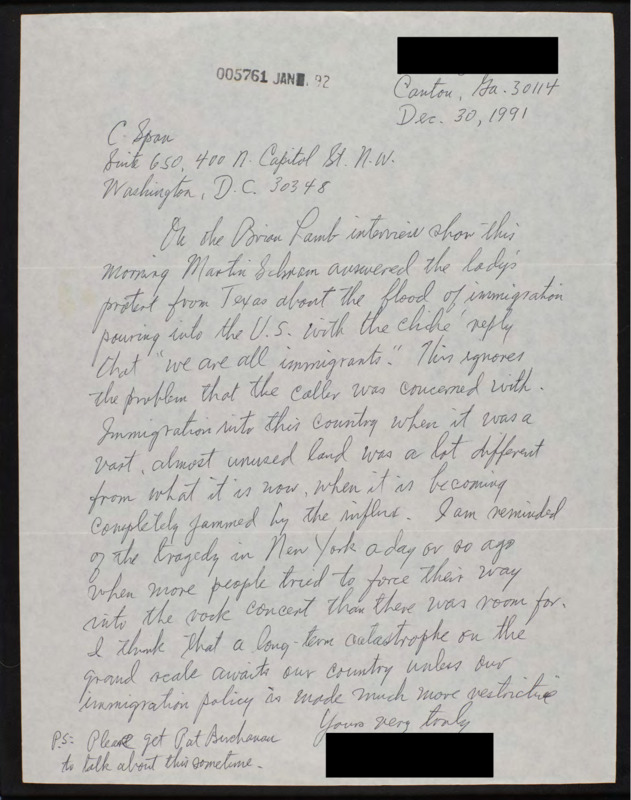 Letter to C-SPAN, 1991-12-30; 30114