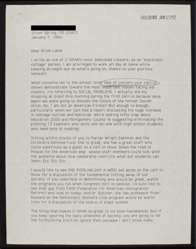 Complains about C-SPAN's call in programs not covering prominent social problems like teenage suicide and education.