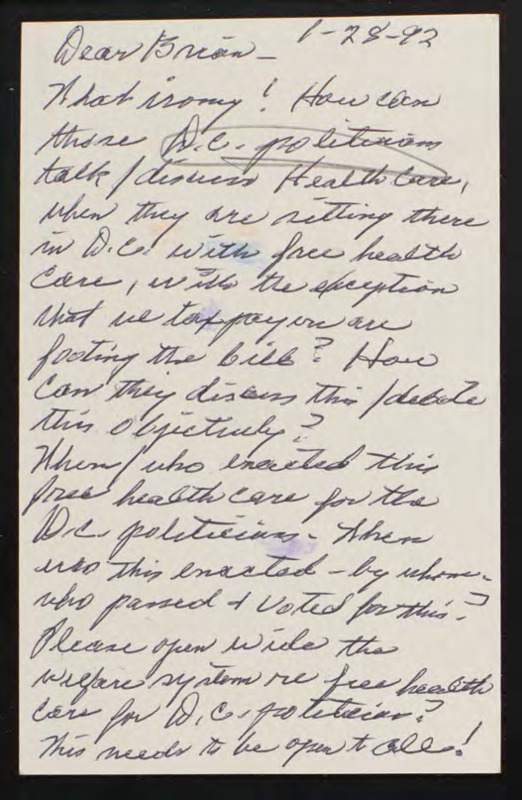 Inquires why politicians from D.C. are discussing health-care if they receive it for free.
