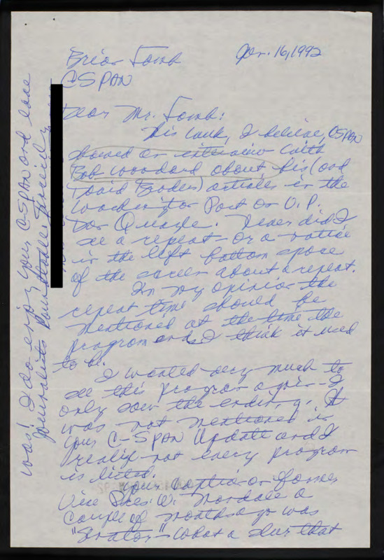 Letter to C-SPAN, 1992-01-16; 90036