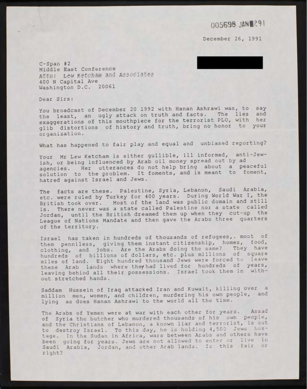 States opinion that a C-SPAN guest is against Jewish people and Israel and then contrasts Palestine and Israel. Attached is an article about Moammar Gadhafi and article about a Muslim family murdering their daughter.