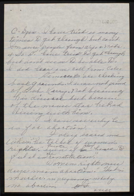 Explains their opinions on abortion and how they are against it being included in the campaign for women's rights, then states dislike of Bush and comments on C-SPAN programs.