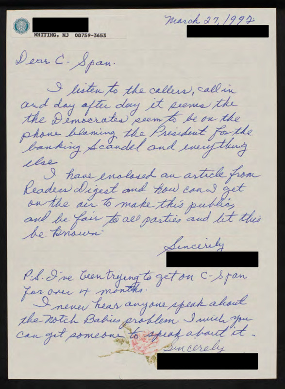 States the only callers during call-ins are Democrats blaming the President for a banking scandal and encloses an article on the subject, then requests "Notch Babies" as a topic of interest.