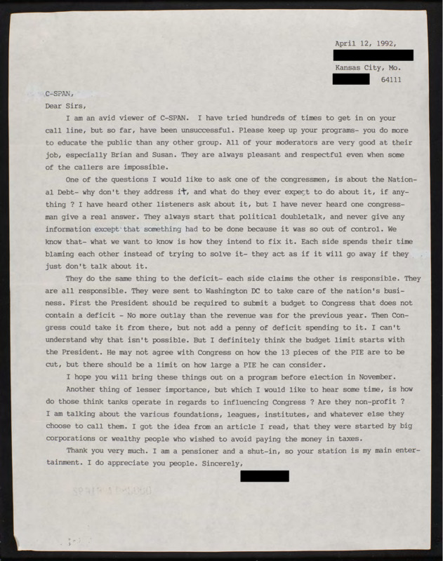 Letter to C-SPAN, 1992-04-12; 64111