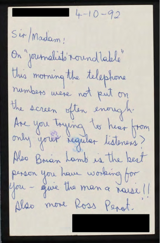 States some of the telephone numbers were not put on the screen, Brian Lamb deserves a raise, and they want to see more Ross Perot.