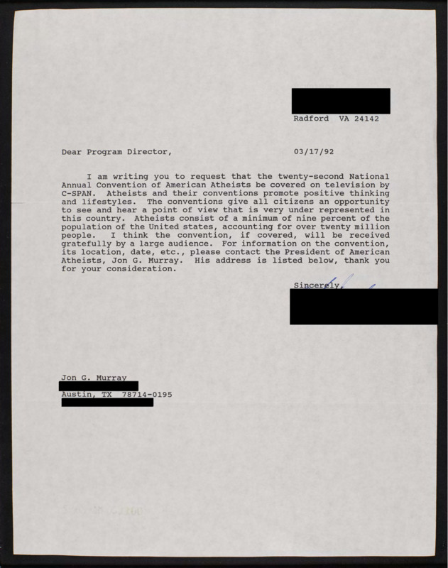 Requests C-SPAN broadcast the American Atheists convention.