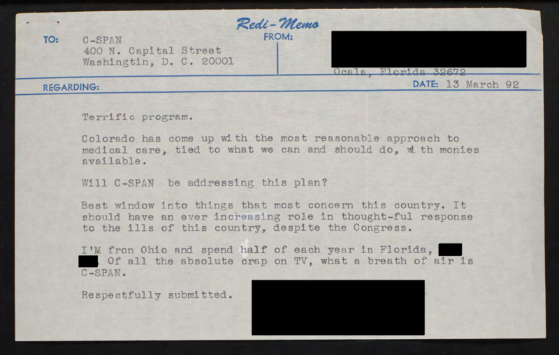 Inquires if C-SPAN will address Colorado's approach to medical care.