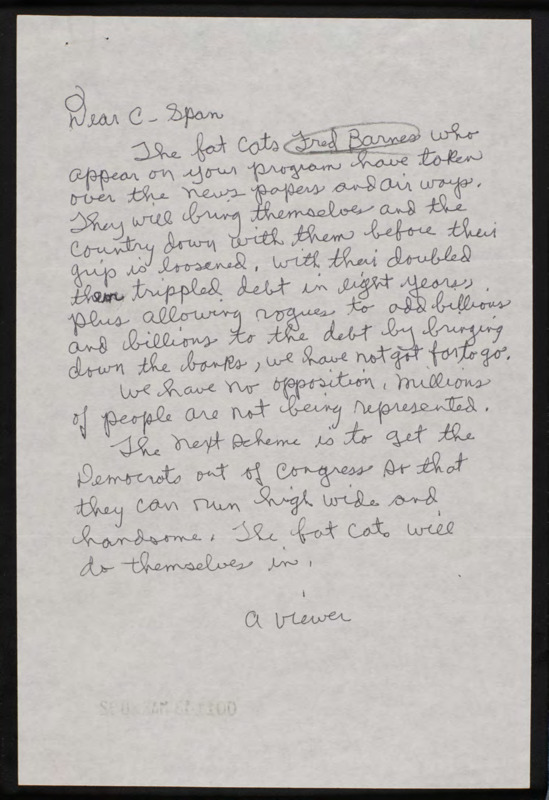 Complains that Fred Barnes is a "fat cat" intent on ruining the U.S. and that millions of people are not represented.