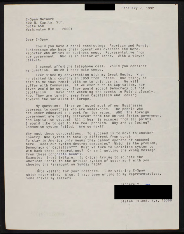 Requests a panel of U.S. and foreign businessmen to discuss outsourced labor; inquires about capitalism and socialism.