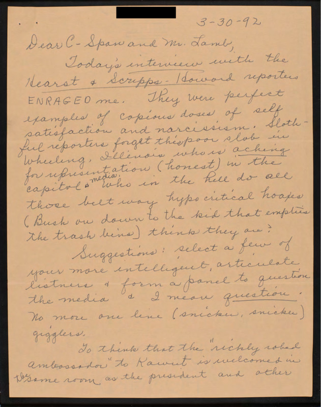 Explains feeling enraged at an interview with two reporters; suggests a panel of viewers to question the media.