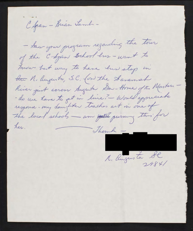 Asks for information about getting the C-SPAN School Bus to come to North Augusta, South Carolina.