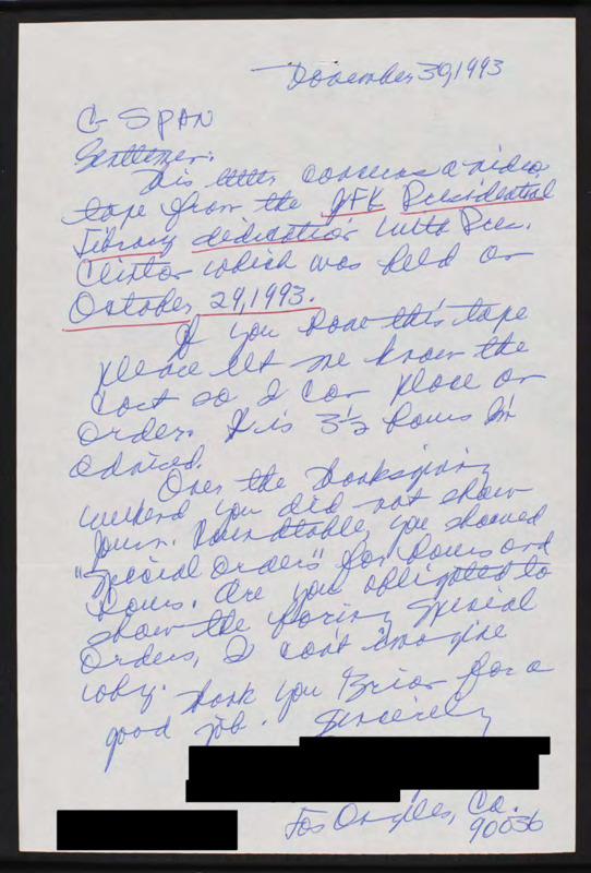 Asks for information about obtaining tape of Clinton dedicating the John F. Kennedy Presidential Library.