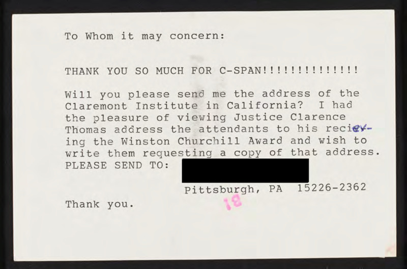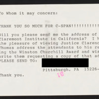 Asks for information about obtaining address of Claremont Institute following a Clarence Thomas speech.