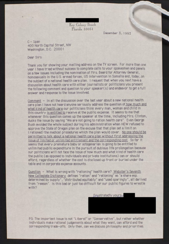 Expresses frustration with call-in process, discusses logistics of health care reform plans.