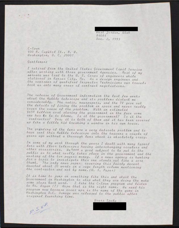 Expresses discontent with the government's spending on repairing the Hubble Space Telescope.