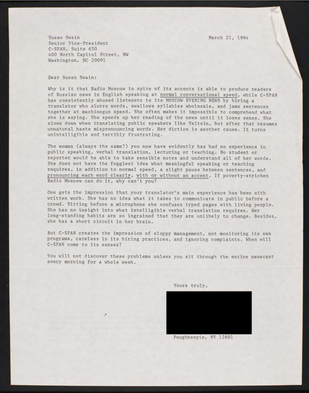 Letter to C-SPAN, 1994-03-21; 12601