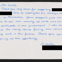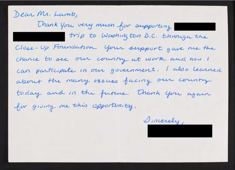 Expresses appreciation for Brian Lamb's involvement with Close Up program and the trip to Washington, D.C.