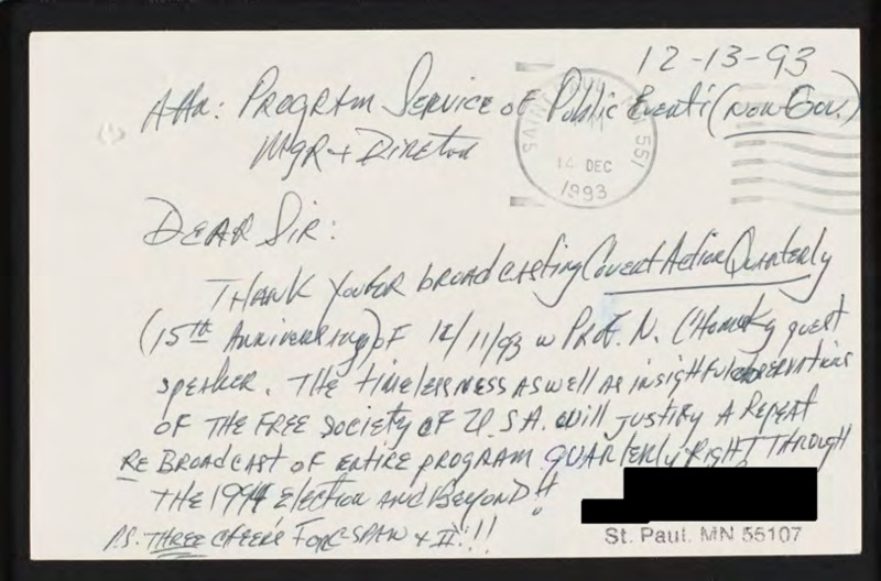 Expresses appreciation for broadcast of Noam Chomsky speech at Covert Action Quarterly.