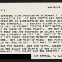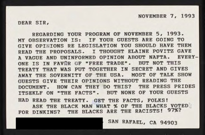 Expresses discontent with journalist guests who were providing misinformation about NAFTA and gives their opinions on the voting habits of African-Americans.