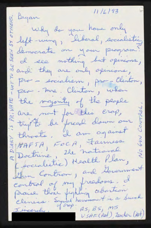 Expresses discontent with pro-Clinton, liberal bias (as well as support for liberal policies) on program.