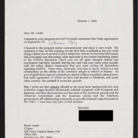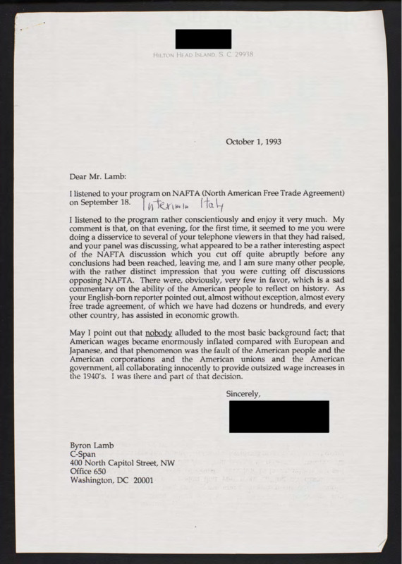 Expresses discontent with Brian Lamb's conduct during call-in show about NAFTA.