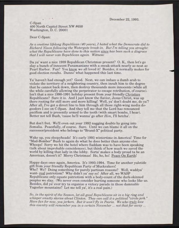 Letter to C-SPAN, 1993-12-22