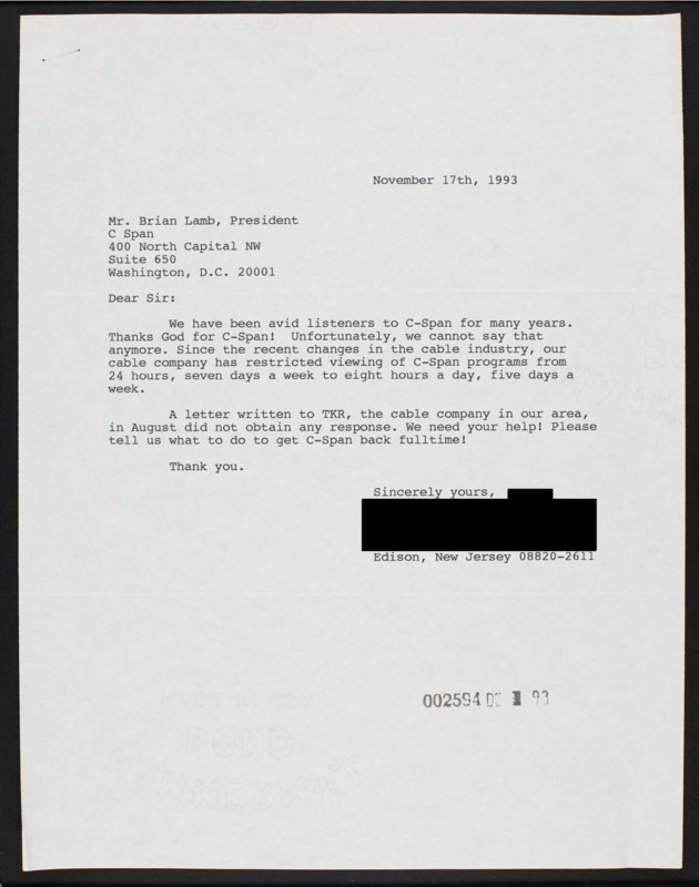 Letter to C-SPAN, 1993-11-17; 08820
