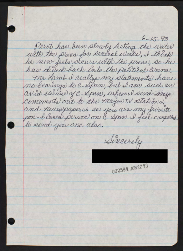 Expresses discontent with Perot and his hypocrisy concerning lobbying and his reentrance into the media.