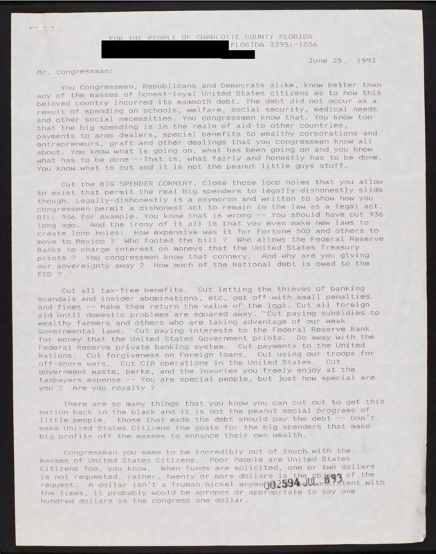 Letter to C-SPAN, 1993-06-25; 33951