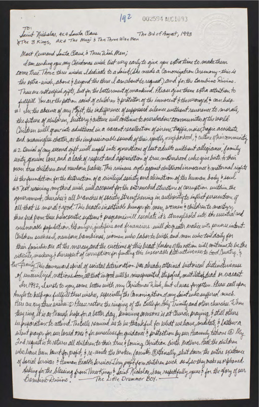 Asks for gifts of returning families to Christian values and ringing of church bells (to symbolize this), to deflect Communism (seeping into American society through social services), stop abortion, and getting rid of political corruption (among other things).