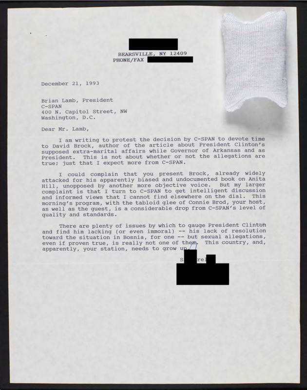 Expresses discontent with David Brock being on program and talking about Clinton's sex life.